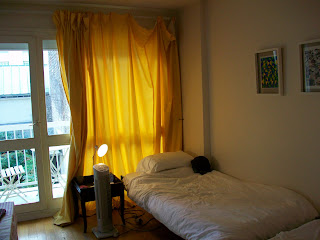 Next we have the living/sleeping/eating/everything room (it’s amazing what 850 euro/month cannot get you in Paris)…. I spared you shots of the other side of the room where I had yet to clean the table. There is also a second bed, a TV, some drawers, and some lamps that you probably are not seeing…. I have to keep a little mystery so folks will come visit me, right?